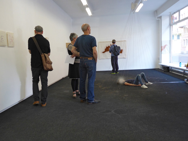 Raumansicht K 25 Luzern mit 'tuch', 'Mantel', 3d-Objekt ('tassen') und Papierschöpfarbeiten