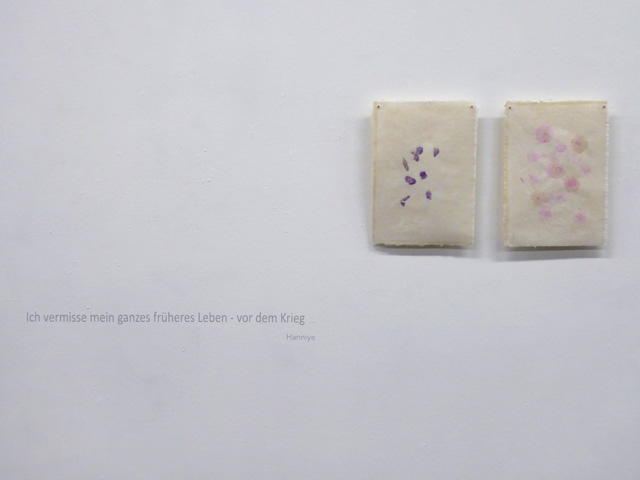Papierschöpfarbeiten aus der Reihe 'erinnerung' 2018 Rosenblätter, handgeschöpftes Papier, Pulp-Malerei, Zitat