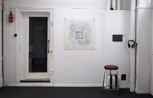 kleiner Raum links: 'bi gsy' Schreibzeichnung 2016/2018 Mixed Media, 81 x 81 cm, Videoinstallation Schwiitzerdütsch Satzschnitte' 2012/2016