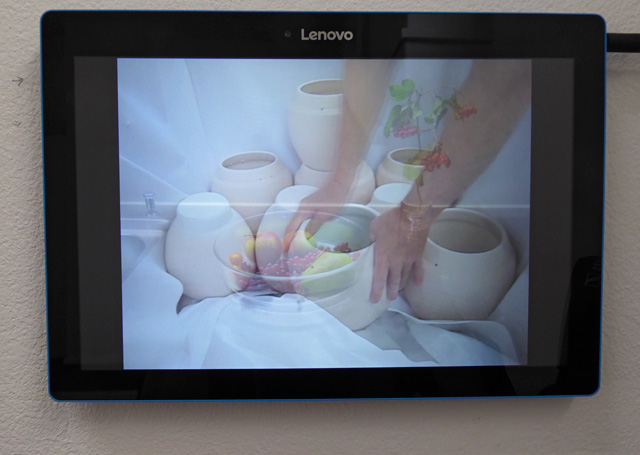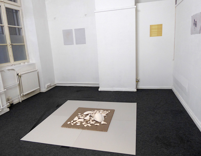 Raumansicht kleiner Raum mit Tonarbeit, Papierschöpfarbeiten zu 'hilde,' Rauminterventionen